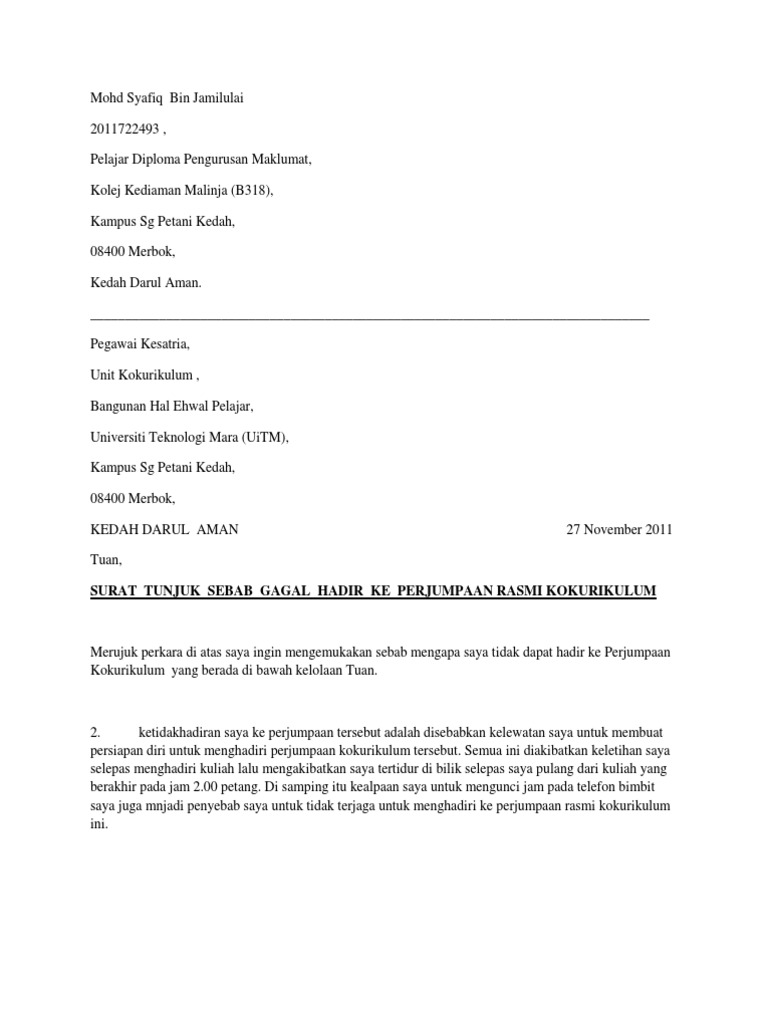 Kandungan surat kandungan surat mestilah mempunyai beberapa perenggan yang mejelaskan mengenai tujuan surat tersebut dihantar. Koleksi surat rasmi pelajar tidak dapat menghadiri diri ke sekolah atas pelbagai alasan munasabah. 10a, lorong idaman 1, taman idaman damai, 51000 kuala lumpur, wilayah persekutuan. Sekiranya pihak tuan ada sebarang kemusykilan di atas ketidakhadiran anak saya, bolehlah pihak. Surat tak hadir sekolah ni memang penting tau tak kisahlah sama ada anak tak hadir kerana demam ke, anak tak hadir sekolah kerana sakit perut ke untuk ibu bapa dan pelajar yang sedang mencari contoh surat rasmi tidak hadir ke sekolah, di sini akan diberikan beberapa contoh dan cara.